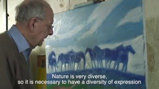 Blending abstraction and expressionism, André Brasilier's lyrical, dreamlike paintings explore an intimate communion with nature. Horses—described by Brasilier as "a superb creation...charged with symbolism, strength, dynamism and beauty"—feature prominently, their elegant forms cantering through serene seascapes, chilly winter woods and brilliant sunsets. The artist's wife and muse, Chantal, is also a favorite subject, often portrayed delicately arranging flowers.