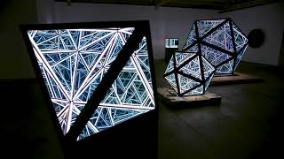 The glass, steel, and LED structures bring a rigid and gleaming tangibility to the abstraction of the numerical calculation of flawless coherence. James’s artworks are compelling approximations, facsimiles of understanding and belief thousands of years old that come down to us on our own terms of modern metals and technological light.