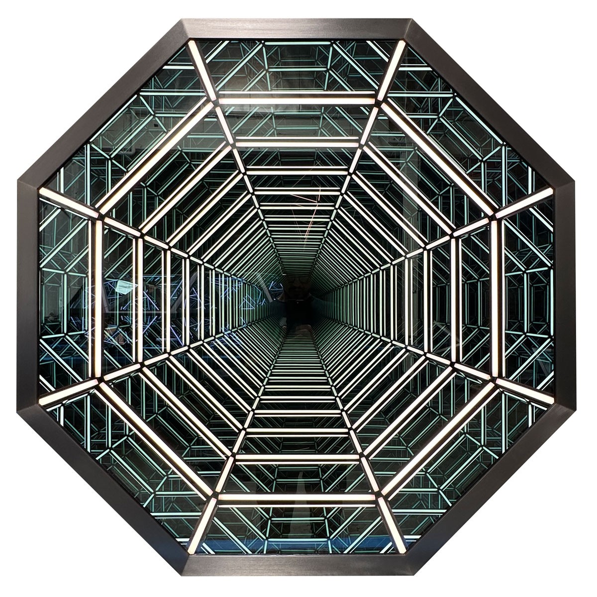 The glass, steel, and LED structures bring a rigid and gleaming tangibility to the abstraction of the numerical calculation of flawless coherence. James’s artworks are compelling approximations, facsimiles of understanding and belief thousands of years old that come down to us on our own terms of modern metals and technological light.