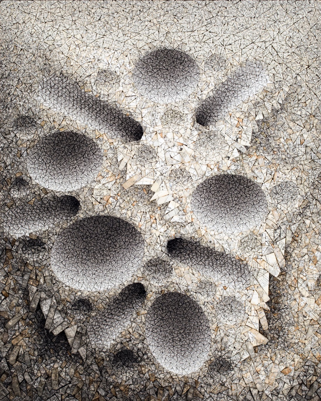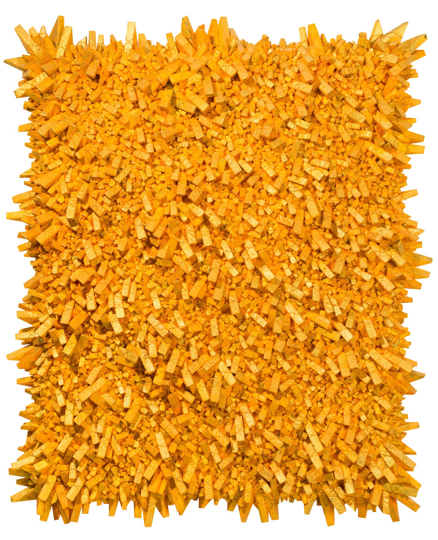 Owing to his studies in the West, Chun was deeply influenced by American and European abstract expressionism. The early stages of his career saw the artist working with paintings until his shift to his textural, crystalline paper sculptures in 1995, for which he is best known. The artist wraps tiny geometric packages in paper and combines them into massive wall-mounted and freestanding assemblages. Each composition comprises thousands of individual mulberry paper parcels, carefully toned with tea and pigment and including the abstracted characters that allude to the paper's origins as old documents. The works, which Chun refers to as 'agreggations', feature gradations in color and smooth craters within their highly textured surfaces. Chun drew inspiration for his signature style from his illness-ridden childhood in Korea and the way that medicine was commonly packaged in triangular paper parcels of mulberry paper, or hanji