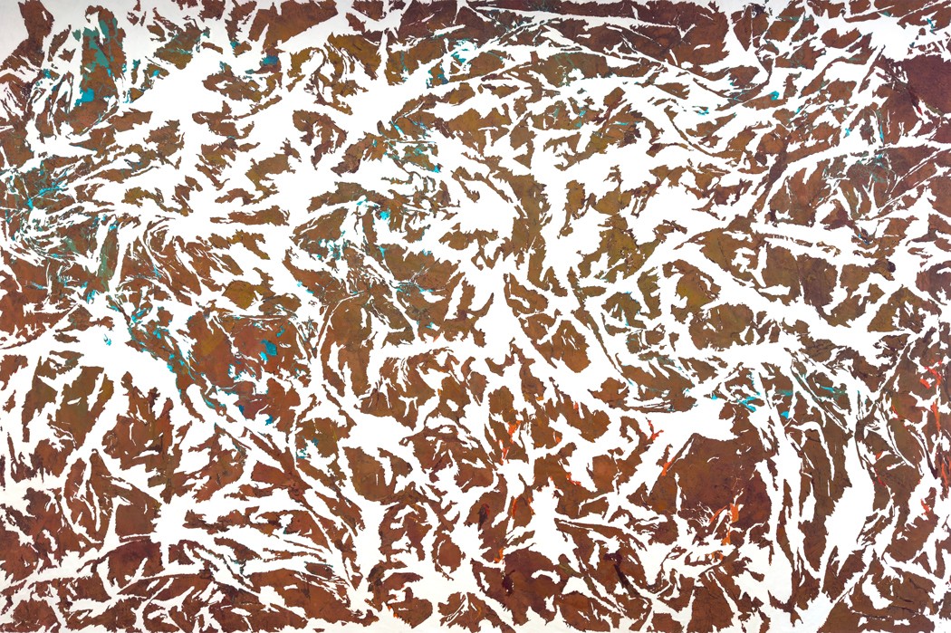 Born in Chambéry, France in 1980, Rubat transitioned from a career in technology into painting during a formative six-year period that he spent living in Los Angeles. He has since returned to the French Alps, where he lives and works today. His process involves layering tissue paper and paint onto a substrate, then transferring it to canvas in a method reminiscent of printmaking. Utilising tools of the artist’s own making, this physically intense process creates an almost sculptural surface where layers of paper adhere irregularly to the canvas, their exact configuration determined by a number of factors within and beyond the artist’s control.