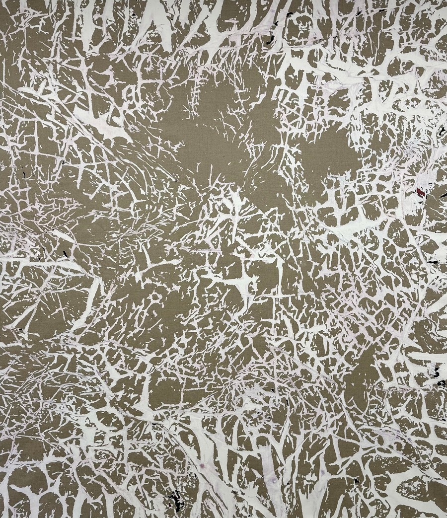 Though non-representational, Rubat’s paintings often evoke natural formations such as cell structures and landscapes. Following the transferring process, he finishes each work by adding and removing layers in specific spots across the canvas. This process, guided by the artist’s intuition, brings a crucial element of intentionality to each painting. Conceptually, Rubat’s paintings are informed by his experiences with technology, forming a dialogue with rational thinking and rule-based processes on one side and the introduction of randomness on the other.