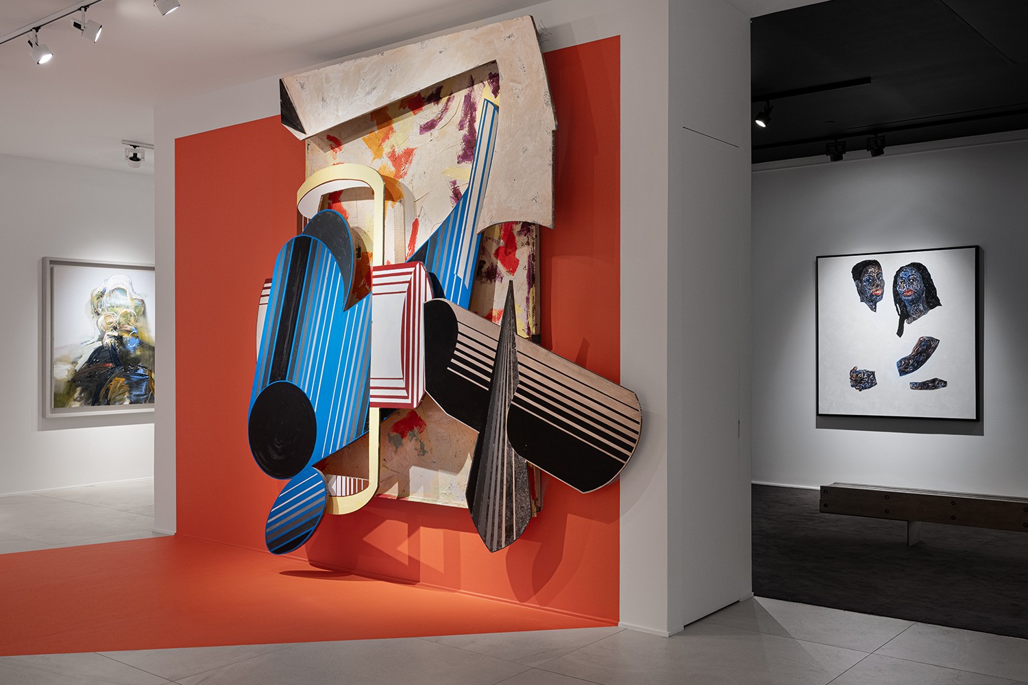 The exhibition also explores the duality of black & white. Pierre Soulages engages with this color combination to explore black’s ability to amplify light and construct space, as seen in Peinture 202 x 143 cm (1967), while Amoako Boafo’s Embrace (2023)—depicting two black figures on a stark white background—explores blackness through portraiture as a statement of cultural identity and pride.