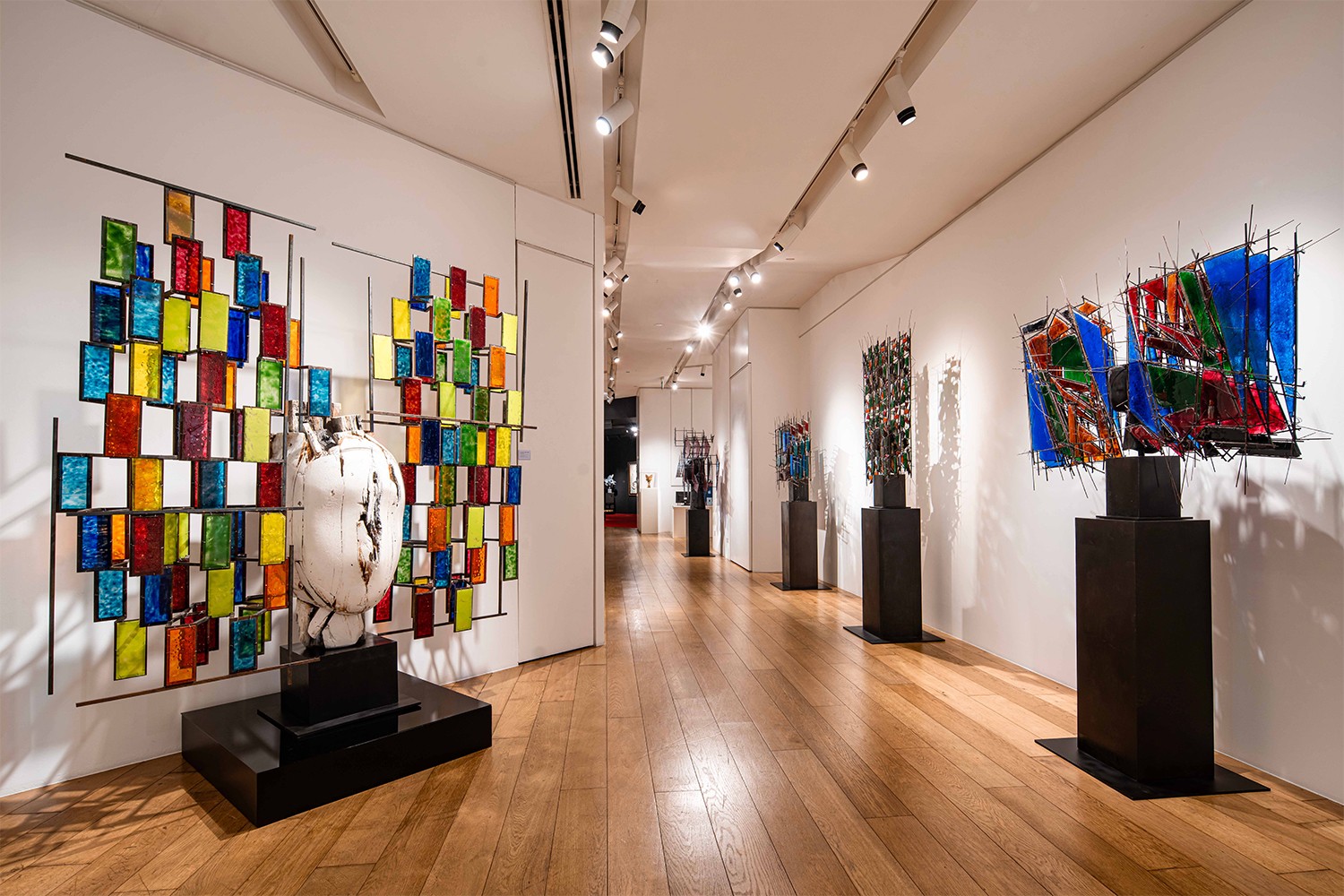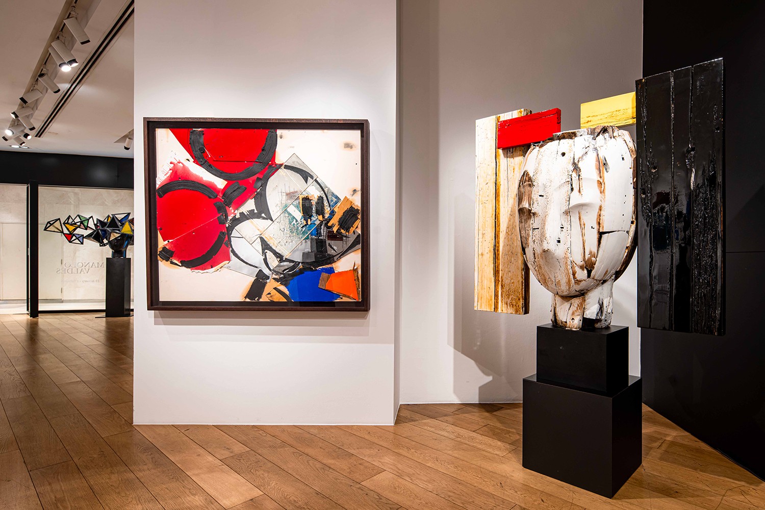 The exhibition traces how his recurring motifs evolve across time and media, showcasing his dialogue between tradition and innovation. Iconic Infanta Margarita sculptures—crafted from painted wood to aluminum—stand alongside textural portraits in burlap and oil on canvas, exemplifying Valdés’ distinctive exploration of form and material. Sculptural busts in Murano glass and bronze, such as Cabeza con formas geométricas (2023), reveal refined symmetry, while textural mixed-media portraits like Doble cara en rosa (2023) depict two ambiguous figures layered with contrasting hues and textures.